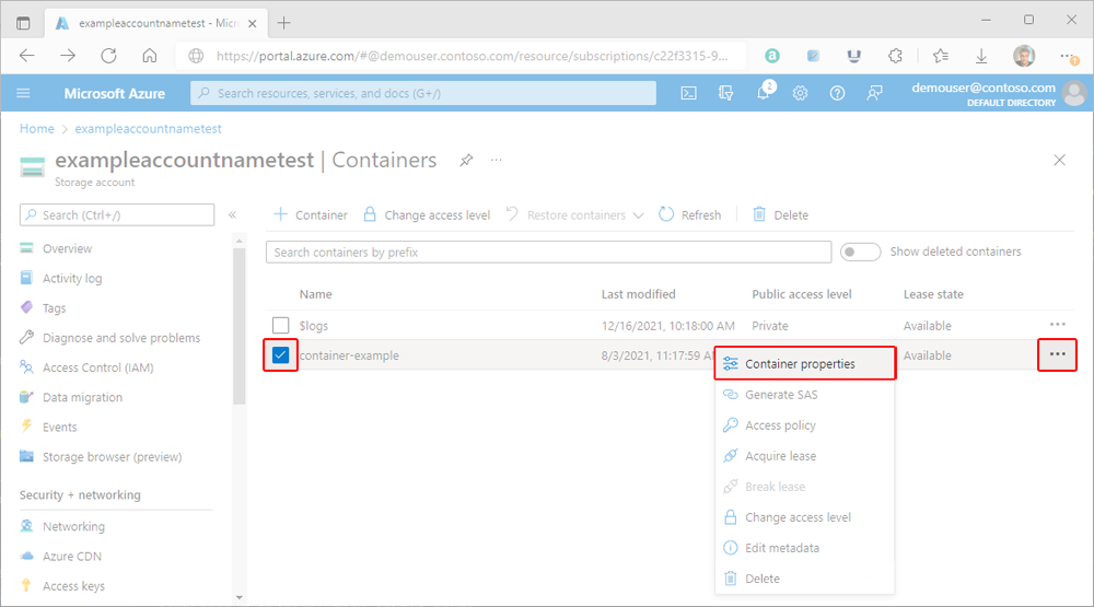 Para mostrar las propiedades de un contenedor en Azure Portal, siga estos pasos: