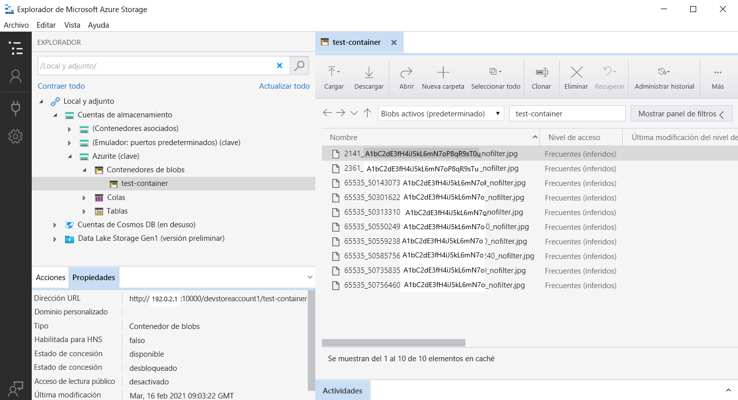 Después de ejecutar las pruebas, puede ver los archivos en Azurite Blob Storage mediante el Explorador de Azure Storage.