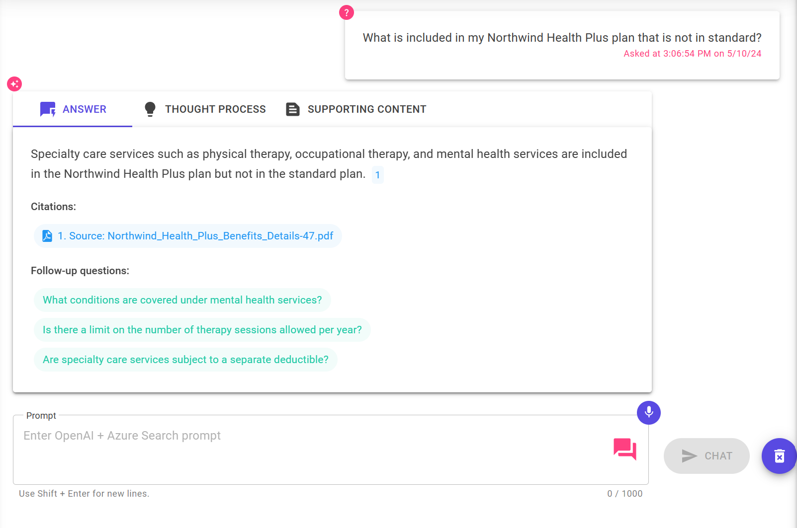 La aplicación de chat está precargada con información sobre los beneficios de los empleados a partir de archivos PDF. Puede utilizar la aplicación de chat para hacer preguntas sobre los beneficios. Los siguientes pasos le guiarán a través del proceso de uso de la aplicación de chat.