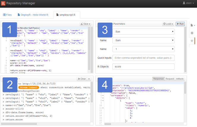 Any DeployR user who can access a script can also test that script by running the script, changing the input values, and then running it again in the Test page.