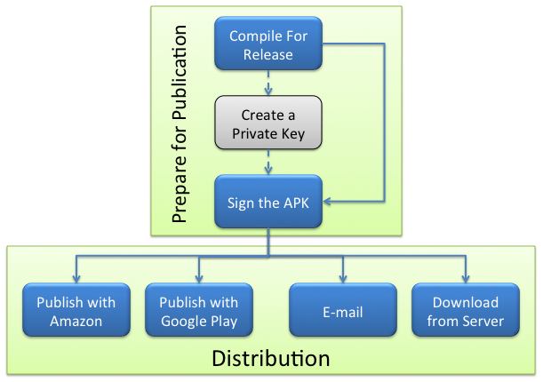 Como puede observarse en el diagrama anterior, la preparación es la misma independientemente del método de distribución que se utilice. Hay varias formas de poner una aplicación de Android a disposición de los usuarios: