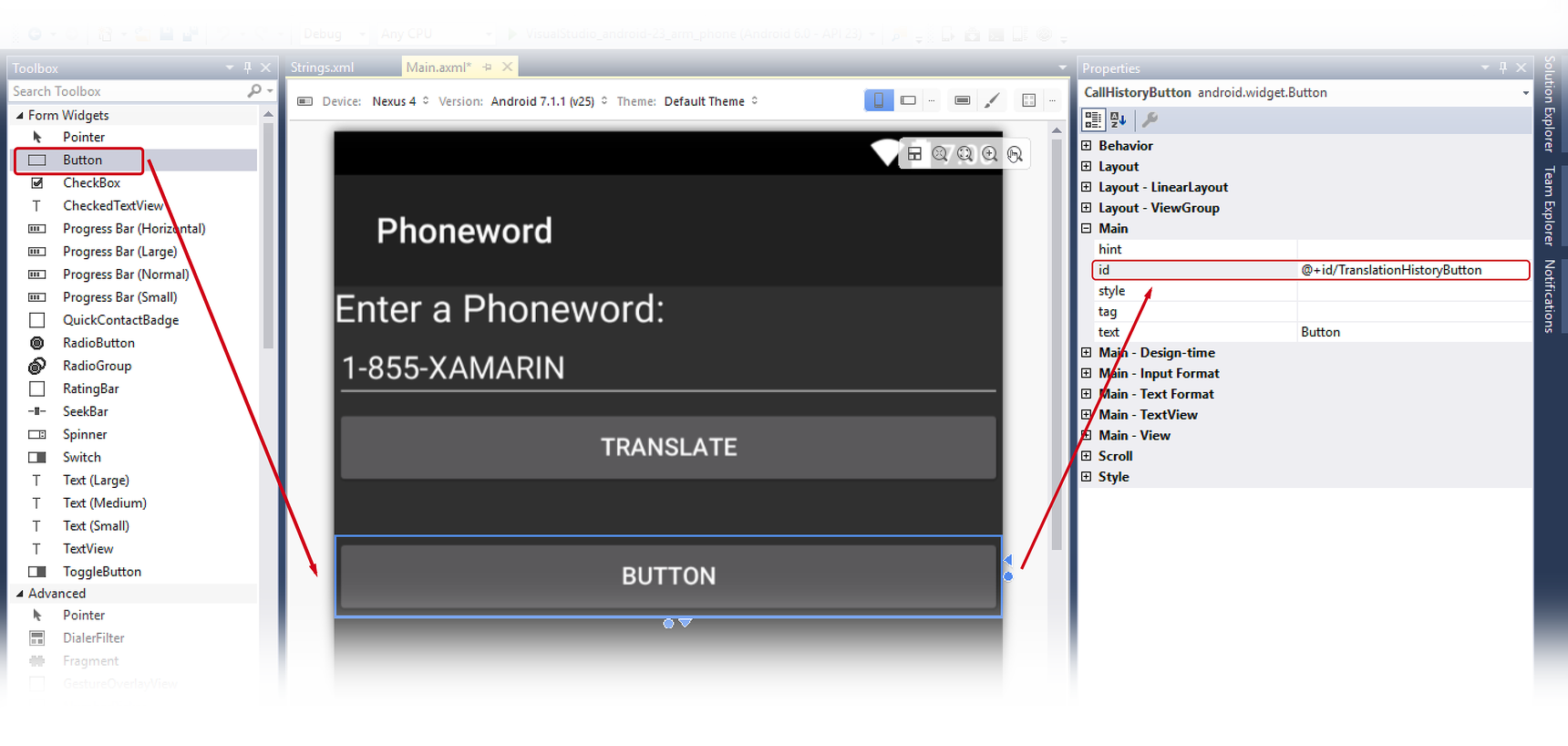 En el cuadro de herramientas, arrastre un botón hasta la superficie de diseño y colóquelo debajo de la vista de texto TranslatedPhoneWord. En el panel Propiedades, cambie el Id del botón por @+id/TranslationHistoryButton.