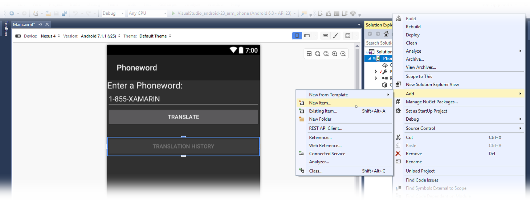 Cree una segunda actividad para activar la segunda pantalla. En el Explorador de soluciones, haga clic con el botón derecho en el proyecto Phoneword y seleccione Agregar > Nuevo elemento...: