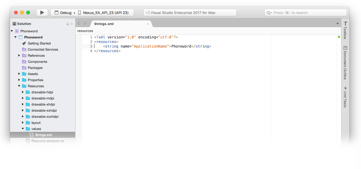 Expanda el nodo values situado debajo de la carpeta Recursos en Panel de solución y haga doble clic en el archivo de recursos de cadena, Strings.xml: