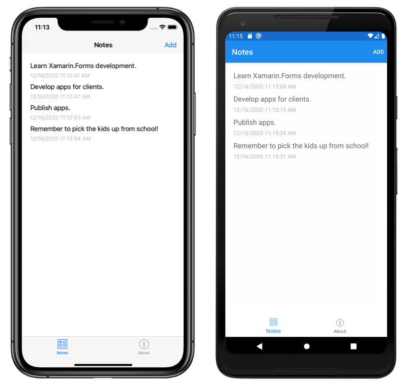 En NotesPage presione el botón Agregar para navegar hasta NoteEntryPage y escriba una nota. Después de guardar la nota, la aplicación volverá a NotesPage.