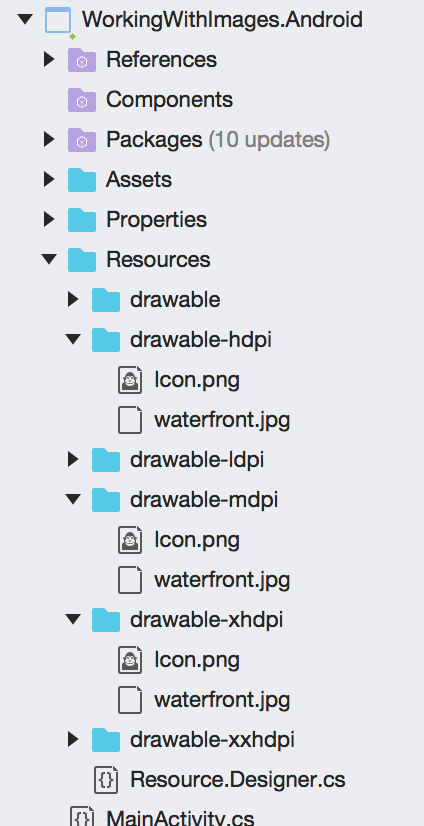 - Android: coloque las imágenes en el directorio Resources/drawable con la acción de compilación: AndroidResource. También se pueden suministrar versiones con valores altos y bajos de PPP de una imagen (en subdirectorios apropiadamente denominados Resources como drawable-ldpi, drawable-hdpi, y drawable-xhdpi).