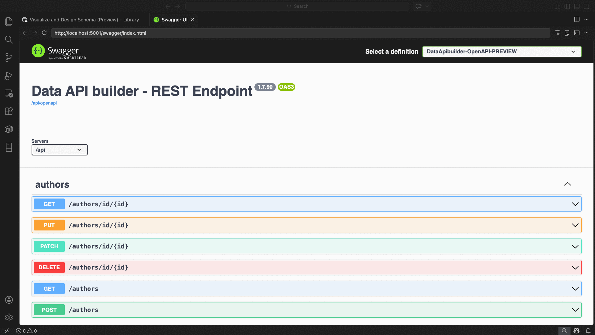 En el ejemplo siguiente se muestra la interfaz de usuario de Swagger para probar los puntos de conexión REST directamente en Visual Studio Code:
