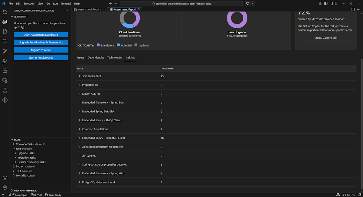 - Toepassingsgegevens: basisinformatie over uw toepassing, waaronder Java-versie, frameworks, buildhulpprogramma's, projectstructuur en doelservice van Azure.