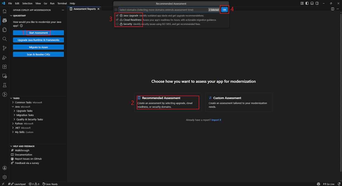 - Selecteer Evaluatie starten of Evaluatiedashboard openen in de sectie QUICKSTART van het deelvenster GitHub Copilot-modernisering.