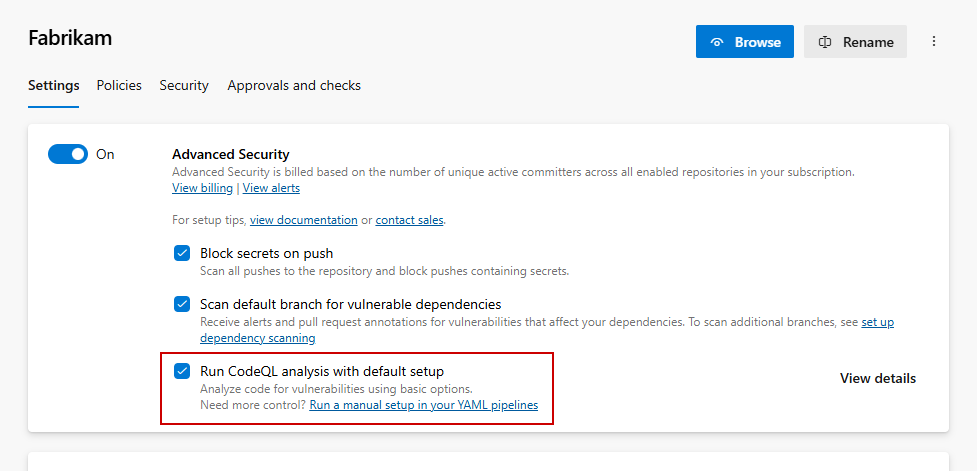 Geavanceerde installatie biedt u volledige controle over de scanconfiguratie door CodeQL-pijplijntaken rechtstreeks aan uw pijplijnen toe te voegen. Zie Codescan instellen voor meer informatie over het configureren van geavanceerde instellingen.