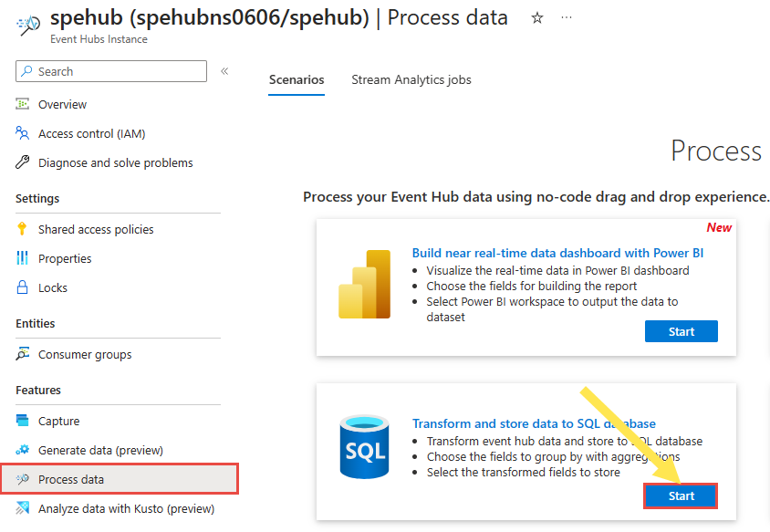 In deze sectie maakt u een Azure Stream Analytics-taak met behulp van de no-code-editor. De taak transformeert gegevensstreaming vanuit een Event Hubs-exemplaar (Event Hub) en slaat resultaatgegevens op in een Azure SQL-database.