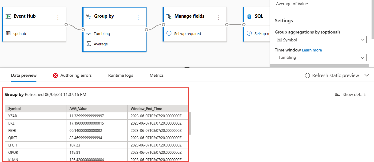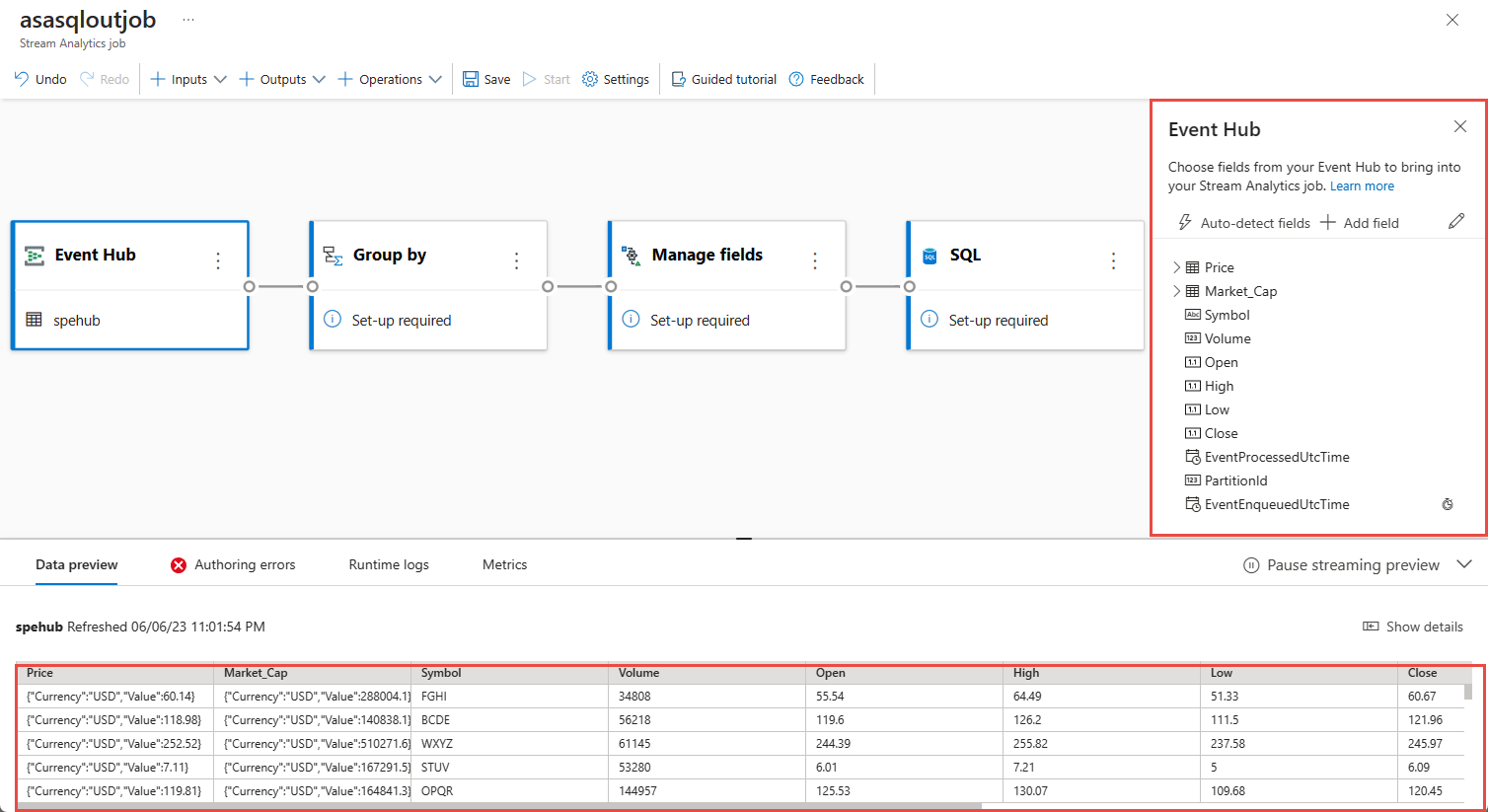Een livevoorbeeld van binnenkomende gegevens in de tabel Gegevensvoorbeeld onder de diagramweergave. Het wordt automatisch periodiek vernieuwd. U kunt streamingvoorbeeld onderbreken selecteren om een statische weergave van de voorbeeldinvoergegevens te bekijken.