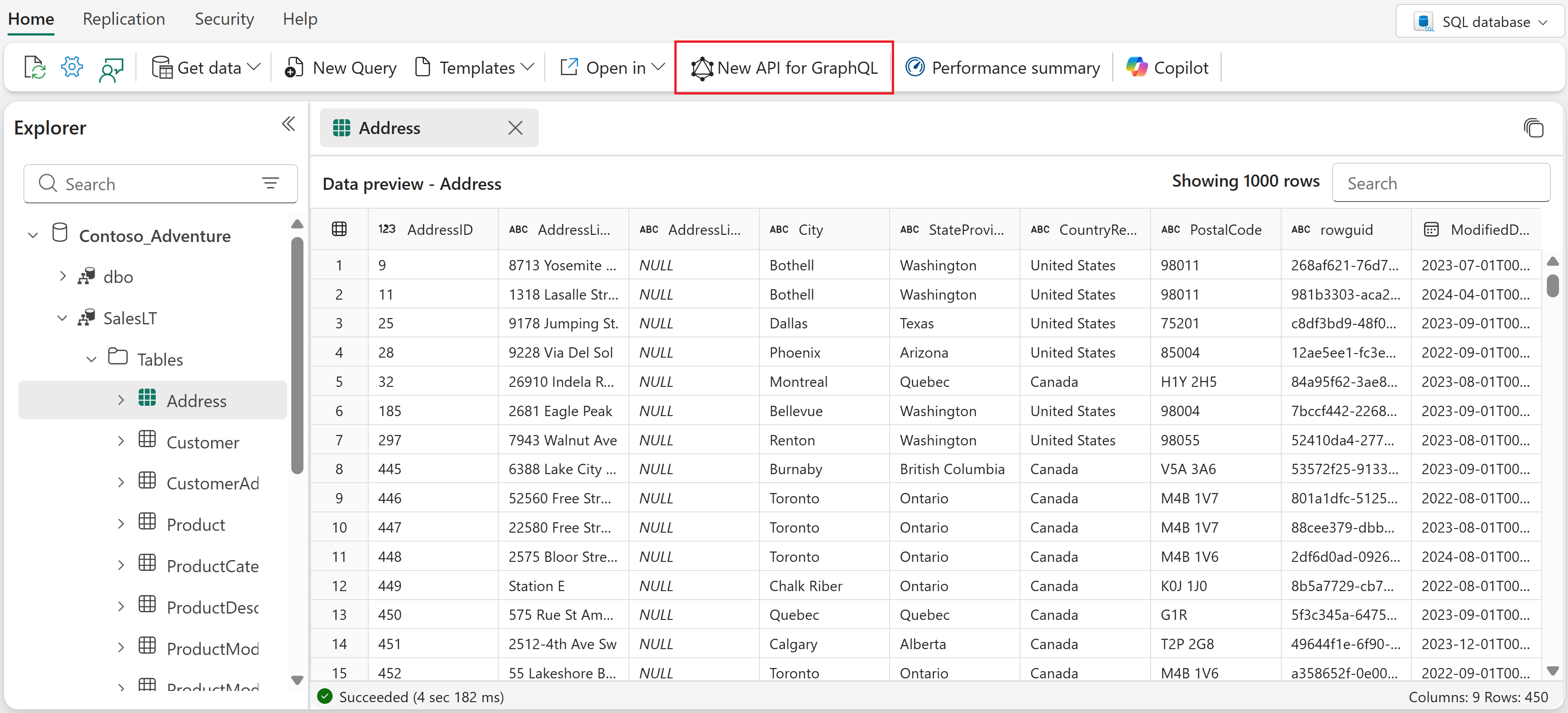 Selecteer in uw SQL-database nieuwe API voor GraphQL op het lint.