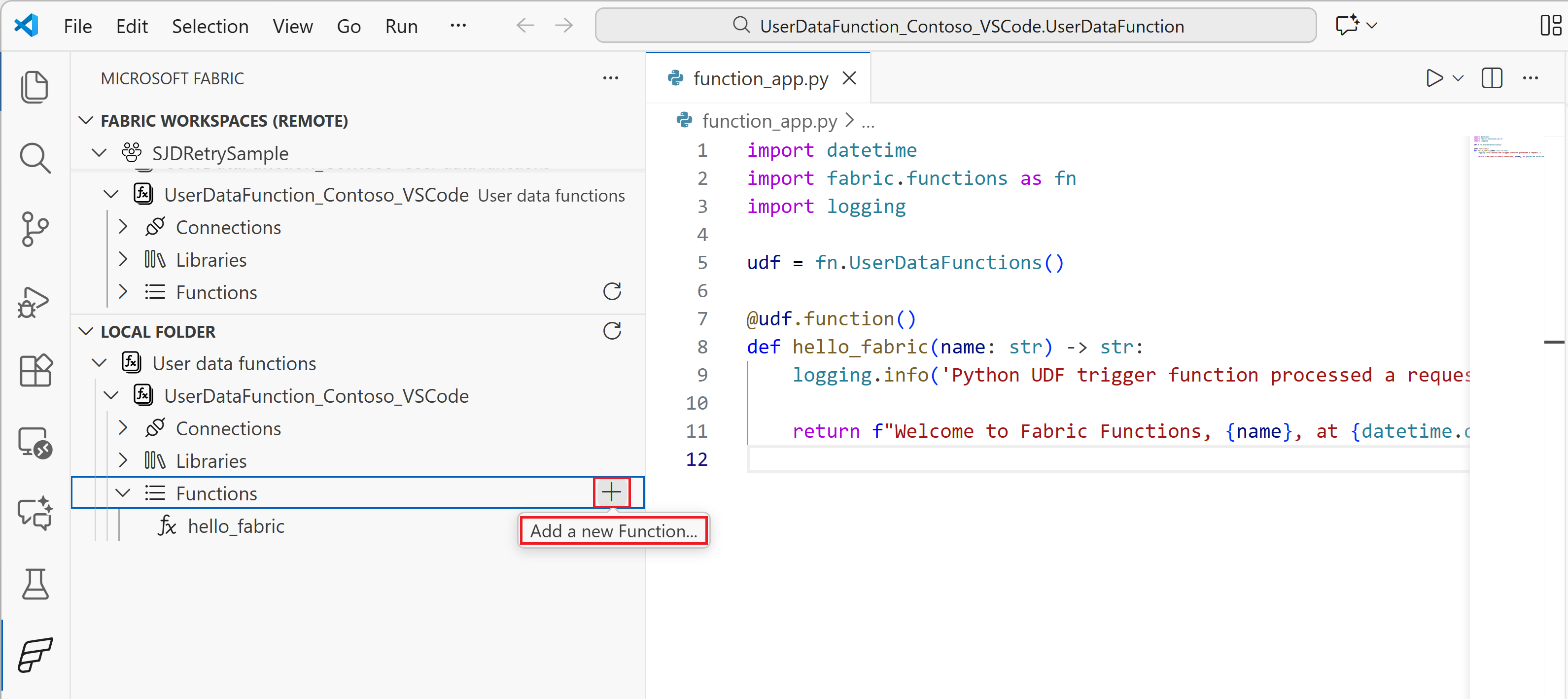 U kunt Visual Studio Code gebruiken met een set extensies om functies voor gebruikersgegevens te maken en te beheren. Met de microsoft Fabric-extensie en de extensie voor gebruikersgegevens voor Fabric voor VS Code kunt u functies lokaal schrijven, ze testen met onderbrekingspunten en rechtstreeks publiceren naar uw Fabric-werkruimte, allemaal in uw editor.
