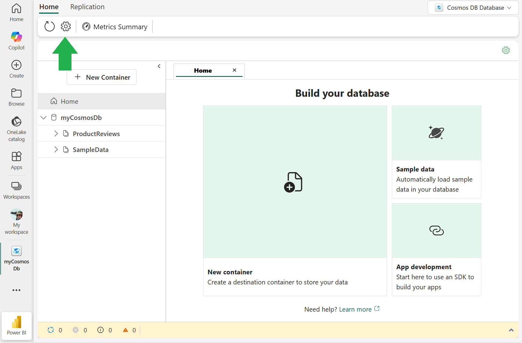 azure-cosmos-bibliotheek en installeer deze. Zie Bibliotheken beheren voor meer informatie.Ga naar de iteminstellingen van Fabric Cosmos DB .