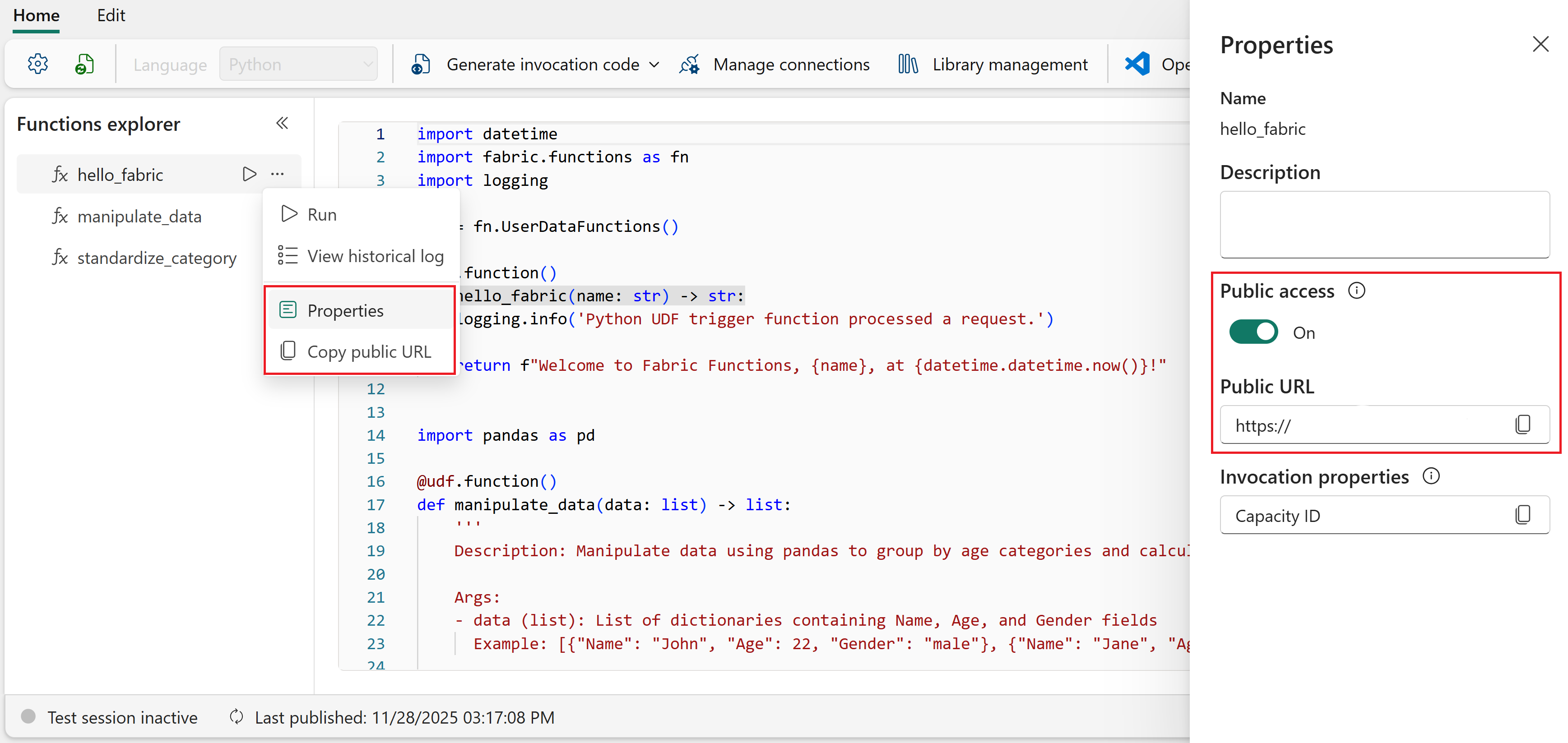 U kunt fabric-gebruikersgegevensfuncties aanroepen vanuit externe toepassingen door HTTP-aanvragen te verzenden naar het openbare eindpunt van de functie. Hiermee kunt u uw Fabric-bedrijfslogica integreren in web-apps, automatiseringsscripts, microservices of een systeem buiten de Fabric-omgeving.