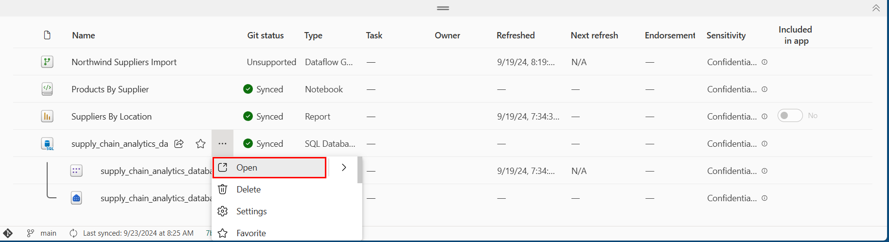 Open uw werkruimte en zoek de SQL-database in Fabric die u eerder in deze zelfstudie hebt gemaakt. Selecteer de naam van de database of selecteer het beletselteken naast de databasenaam en selecteer Openen.