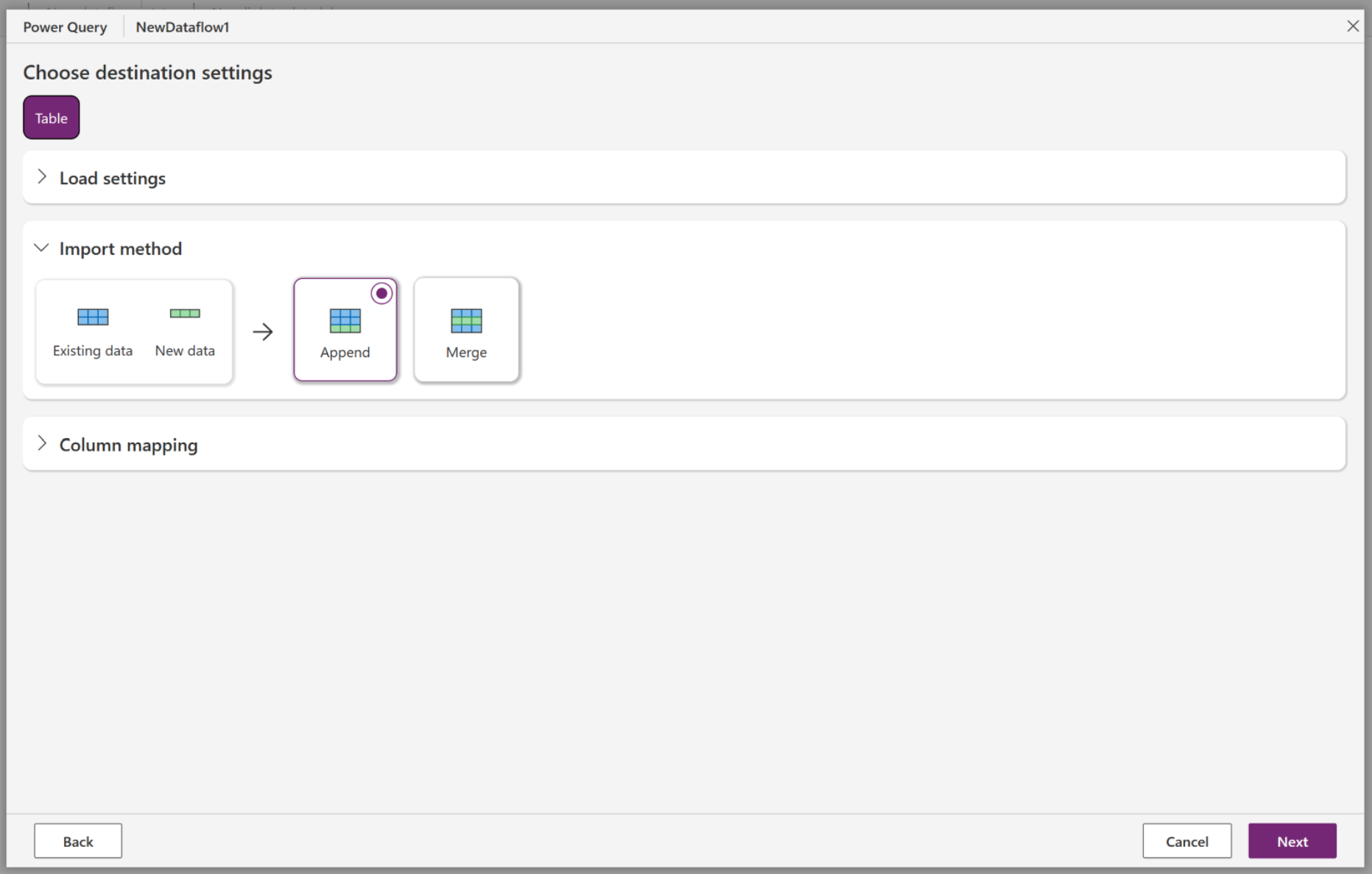 Als u Laden naar bestaande tabel selecteert , kunt u een bestaande Dataverse-tabel opgeven waarnaar gegevens moeten worden geladen.