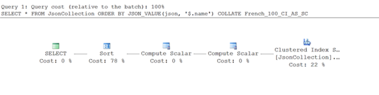 Als u echter de sortering van de ORDER BY-expressie wijzigt, bijvoorbeeld als u COLLATE French_100_CI_AS_SC toevoegt na de functie JSON_VALUE, krijgt u een ander uitvoeringsplan voor query's.