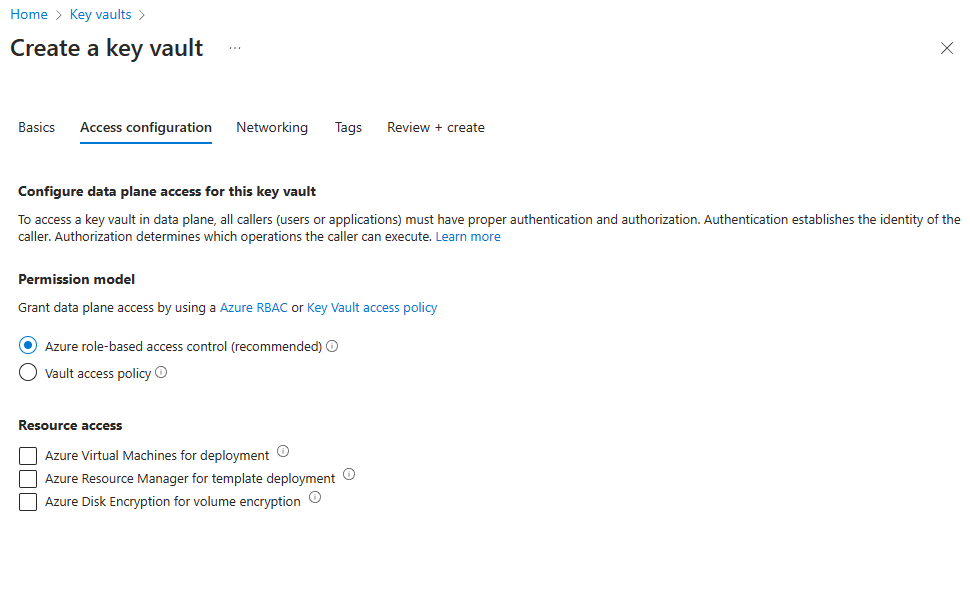 Op het tabblad Toegangsconfiguratie hebt u de mogelijkheid om op rollen gebaseerd toegangsbeheer of kluistoegangsbeleid van Azure te selecteren. We bespreken beide opties, maar de optie voor Azure rolgebaseerd toegangsbeheer wordt aanbevolen. Zie het overzicht van het Access-model voor meer informatie.