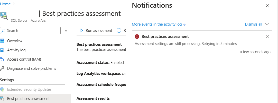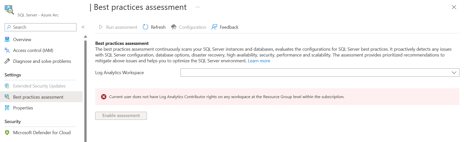 PATCHaanroep naar de API om de Azure-extensie voor sql Server-evaluatie-instellingen bij te werken.PATCH https://management.azure.com/subscriptions/ <subscription-id>/resourceGroups/<resource-group-name>/providers/Microsoft.HybridCompute/machines/<arc-resource-name>/extensions/WindowsAgent.SqlServer?api-version=2022-08-11-previewGa naar Best Practices Assessment op uw SQL Server-resourcepagina met Arc-functionaliteit in Azure Portal en schakel best practices-evaluatie opnieuw in en selecteer een nieuwe Log Analytics-werkruimte.