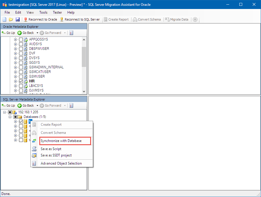 Klik in Oracle Metadata Explorer met de rechtermuisknop op HR en selecteer Gegevens migreren.