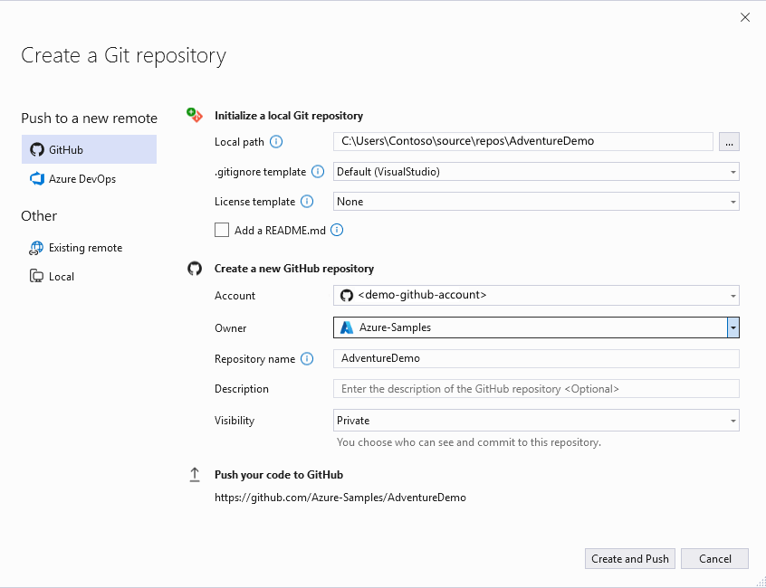 Kies in het dialoogvenster Een Git-opslagplaats maken, in de sectie Push naar een nieuwe externe, GitHub.