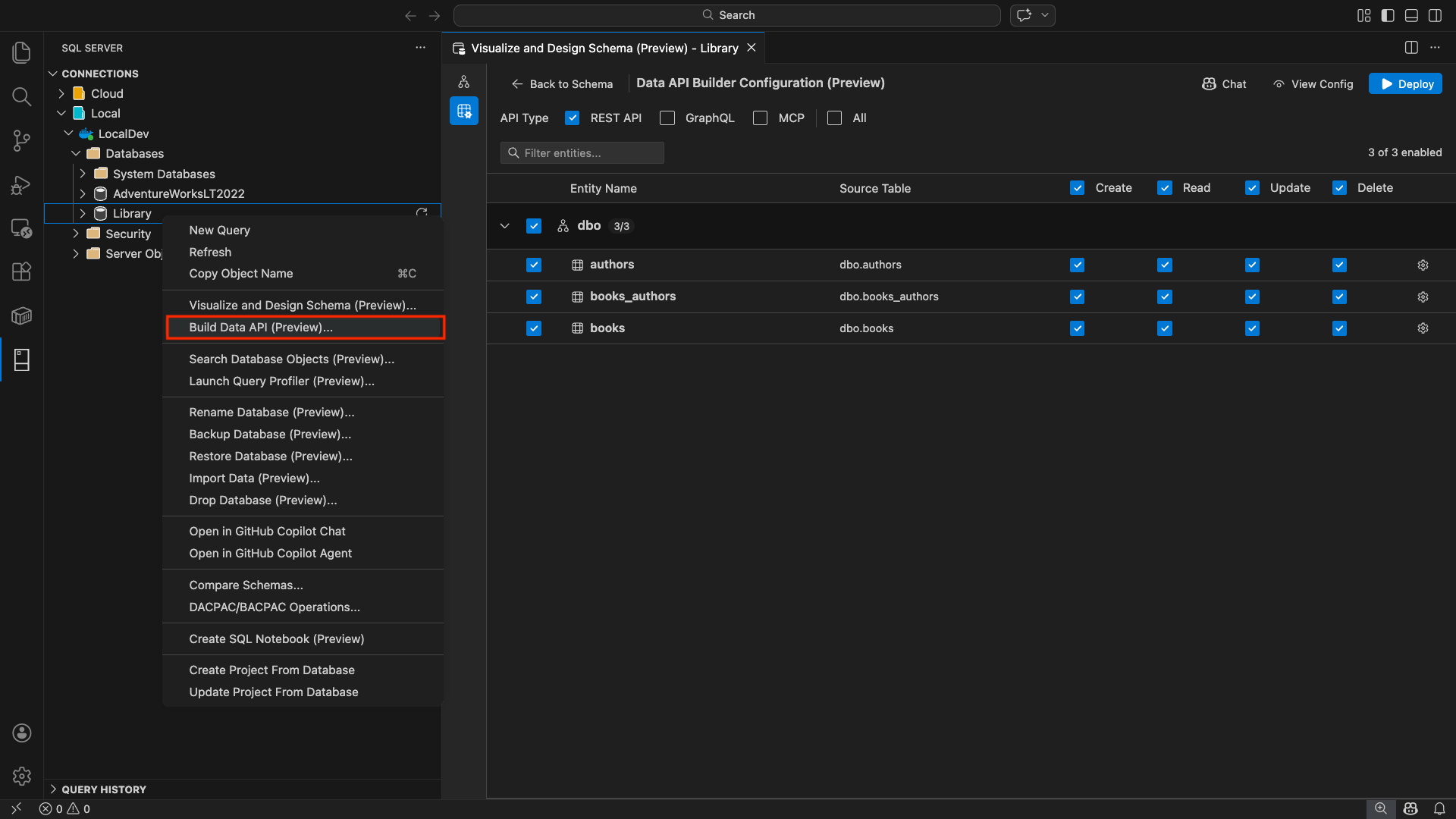 De MSSQL-extensie voor Visual Studio Code bevat een geïntegreerde gebruikersinterface voor Data API Builder, zodat u REST-, GraphQL- en MCP-eindpunten voor uw SQL-databasetabellen kunt maken zonder configuratiebestanden te schrijven of Visual Studio Code te verlaten. U kunt selecteren welke tabellen beschikbaar moeten worden gemaakt, CRUD-machtigingen moeten configureren, API-typen kiezen, een voorbeeld van de gegenereerde configuratie bekijken en een lokale back-end implementeren die mogelijk wordt gemaakt door Data API Builder, allemaal vanuit een visuele interface.