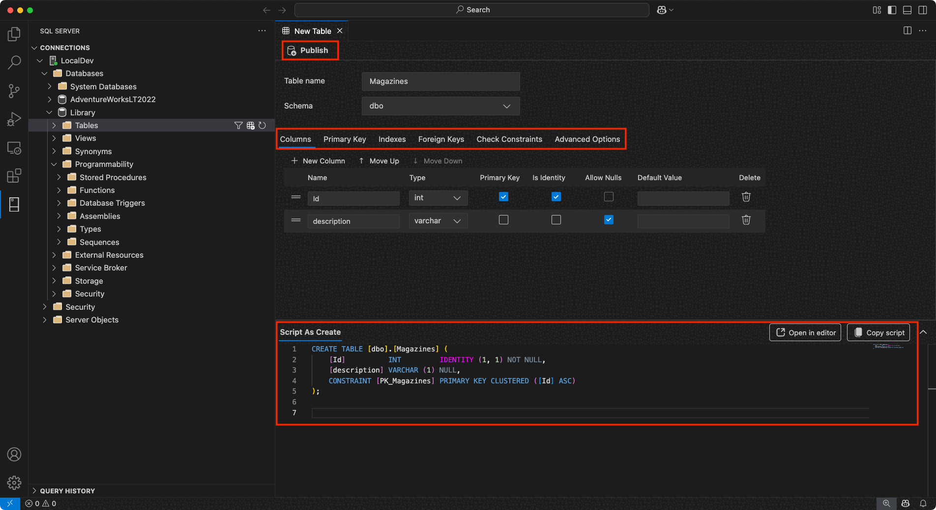 Publiceren: Pas uw wijzigingen rechtstreeks toe op de database door Publiceren te selecteren. Deze actie maakt gebruik van DacFX (Data-tier Application Framework) om uw schema-updates te implementeren.