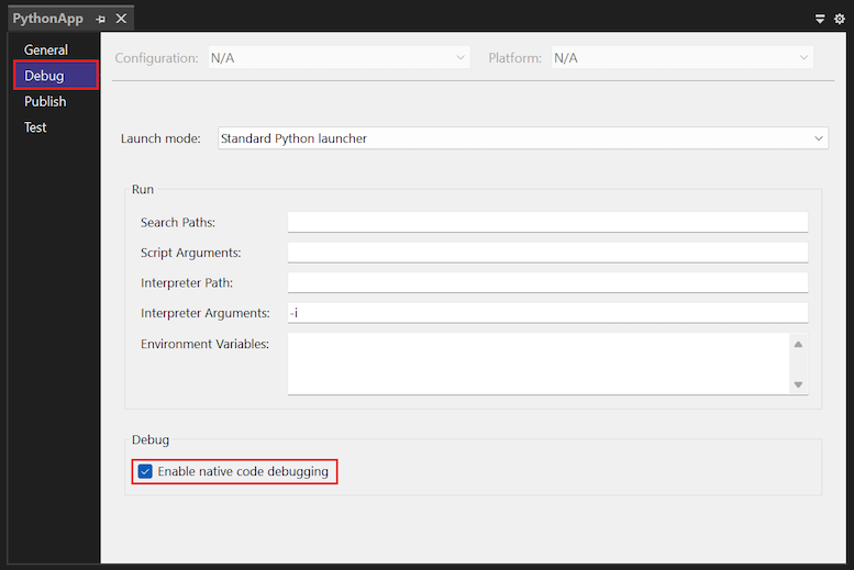 Selecteer in het deelvenster Eigenschappen het tabblad Foutopsporing en selecteer vervolgens de> optieSysteemeigen codeopsporing inschakelen: