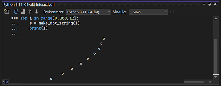 for-lus naar de definitie vanrangeen wijzig de instructie naarrange(0, 360, 12).Selecteer Ctrl+Enter ergens in de