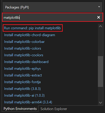 Voer in het zoekveld matplotlib in. Selecteer in de lijst met resultaten de opdracht Uitvoeren: pip install matplotlib optie.