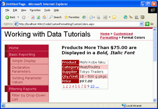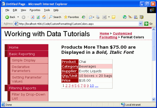 Jednak w wielu scenariuszach wymagania dotyczące formatowania zależą od wartości wyświetlanych danych. Na przykład, aby zwrócić uwagę na produkty, które są niedostępne, raport z informacjami o produkcie może ustawić kolor tła na żółty dla tych produktów, których pola UnitsInStock i UnitsOnOrder są równocześnie równe 0. Aby podkreślić droższe produkty, możemy chcieć wyświetlić ceny tych produktów kosztujących ponad 75,00 USD w czcionki pogrubionej.