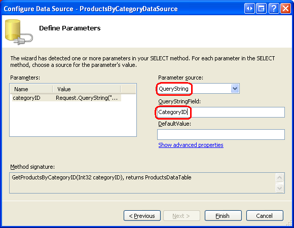 Ostatni krok w kreatorze Konfigurowania źródła danych prosi o podanie źródła parametrów dla categoryID. Ponieważ te informacje są przekazywane przez pole CategoryIDQueryString, wybierz pozycję QueryString z listy rozwijanej i wprowadź CategoryID w polu tekstowym QueryStringField, jak pokazano na rysunku 9. Kliknij Zakończ, aby zakończyć kreatora.