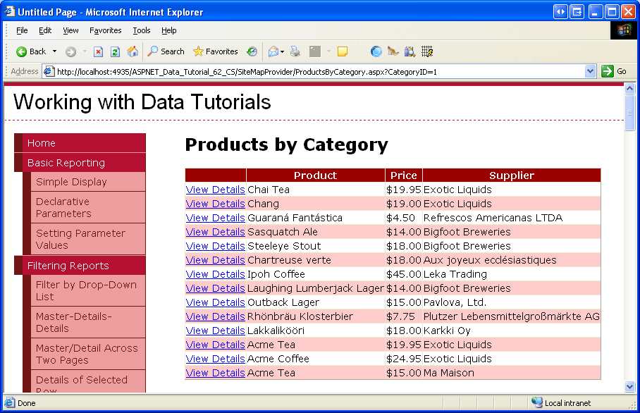 Default.aspx Strony ProductsByCategory.aspx, i ProductDetails.aspx w plikach pobranych dla tego samouczka, na przykład, zawierają wszystkie kontrolki Menu (zobacz Rysunek 20). Zobacz Zaawansowane funkcje nawigacji witryny w ASP.NET 2.0 oraz sekcję Używanie kontrolek nawigacyjnych w ASP.NET 2.0 QuickStarts, aby uzyskać bardziej szczegółowe informacje na temat kontrolek nawigacji i systemu mapy witryny w ASP.NET 2.0.