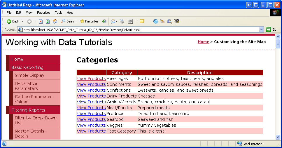 Pamiętaj, aby przetestować funkcję zależności pamięci podręcznej SQL. Po przejściu na strony Default.aspx, ProductsByCategory.aspx i ProductDetails.aspx, przejdź do jednego z samouczków w sekcji Edytowanie, Wstawianie i Usuwanie, a następnie edytuj nazwę kategorii lub produktu. Następnie wróć do jednej ze stron w folderze SiteMapProvider . Zakładając, że dla mechanizmu sondowania minęło wystarczająco dużo czasu, aby zanotować zmianę w bazowej bazie danych, mapa witryny powinna zostać zaktualizowana w celu wyświetlenia nowej nazwy produktu lub kategorii.