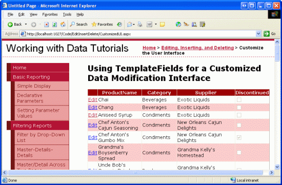 Kontrolki BoundFields i CheckBoxFields używane przez GridView i DetailsView upraszczają proces modyfikacji danych dzięki możliwości renderowania interfejsów w trybie tylko do odczytu, edytowalnym i z możliwością wstawiania. Te interfejsy można renderować bez konieczności dodawania dodatkowych znaczników deklaratywnych lub kodu. Jednak interfejsy BoundField i CheckBoxField nie mają możliwości dostosowywania często potrzebne w rzeczywistych scenariuszach. Aby dostosować interfejs do edycji lub wstawiania w GridView lub DetailsView, należy zamiast tego użyć TemplateField.