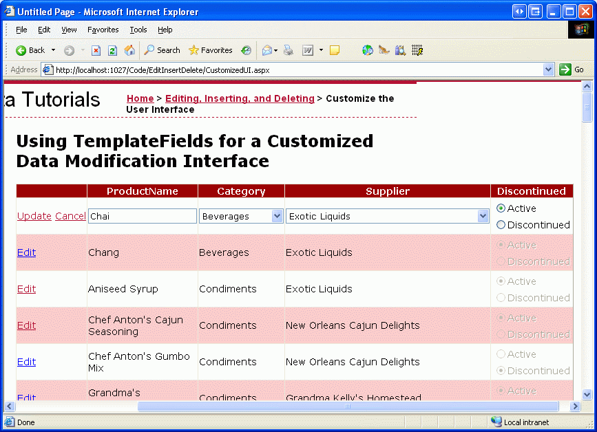 Obecnie pole danych produktów Discontinued jest wyrażane przy użyciu pola CheckBoxField, które renderuje wyłączone pole wyboru dla wierszy tylko do odczytu i włączone pole wyboru dla edytowanego wiersza. Chociaż ten interfejs użytkownika jest często odpowiedni, możemy dostosować go w razie potrzeby przy użyciu pola szablonu. W tym samouczku zmieńmy pole CheckBoxField na pole szablonu, które używa kontrolki RadioButtonList z dwiema opcjami "Aktywne" i "Przerwane", z których użytkownik może określić wartość produktu Discontinued .