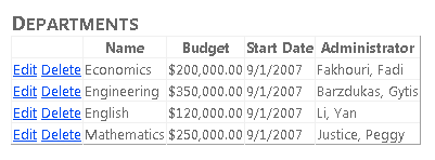 Po zapisaniu zmiany nie będzie można usunąć wiersza z Person tabeli, jeśli ta osoba jest administratorem działu. W aplikacji produkcyjnej należy podać określony komunikat o błędzie, gdy ograniczenie bazy danych uniemożliwia usunięcie lub określisz kaskadowe usunięcie. Aby zapoznać się z przykładem sposobu określania kaskadowego usuwania, zobacz Temat Entity Framework i ASP.NET — Wprowadzenie — część 2.