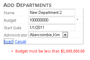 Jeśli wprowadzisz nieprawidłową kwotę budżetu , a następnie kliknij przycisk Aktualizuj, zobaczysz tę samą gwiazdkę i komunikat o błędzie widoczny na stronie Departments.aspx .