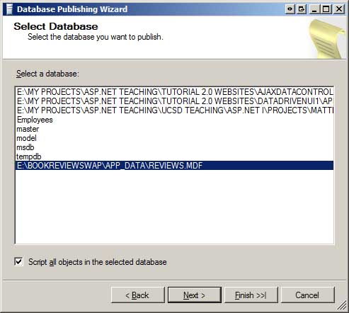 Innym podejściem jest użycie Kreatora publikowania bazy danych. Kreator publikowania bazy danych to aplikacja klasyczna systemu Windows, która wygeneruje polecenia SQL w celu utworzenia schematu bazy danych — tabel, procedur składowanych, widoków, funkcji zdefiniowanych przez użytkownika itd. — i, opcjonalnie, danych w tabelach. Następnie możesz nawiązać połączenie z serwerem bazy danych dostawcy hosta sieci Web za pomocą programu SQL Server Management Studio, a następnie wykonać ten skrypt, aby zduplikować bazę danych w środowisku produkcyjnym. Jeszcze lepiej, jeśli dostawca usług hostingowych obsługuje Usługi publikowania baz danych Microsoft, skrypt wygenerowany przez Kreatora publikowania bazy danych jest automatycznie wykonywany na serwerze bazy danych w Twoim imieniu. Ponieważ Kreator publikowania bazy danych generuje skrypt, który tworzy schemat i dane bazy danych, będzie działać niezależnie od tego, czy dostawca hosta sieci Web oferuje funkcje, takie jak dołączanie przekazanego .mdf pliku.