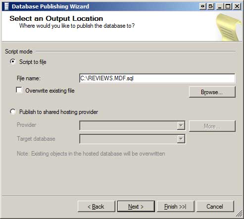 Na następnym ekranie możesz wygenerować plik skryptu lub, jeśli host internetowy go obsługuje, opublikować bazę danych bezpośrednio na serwerze bazy danych dostawcy hosta sieci Web. Jak pokazano na rysunku 7, mam skrypt napisany w pliku C:\REVIEWS.MDF.sql.
