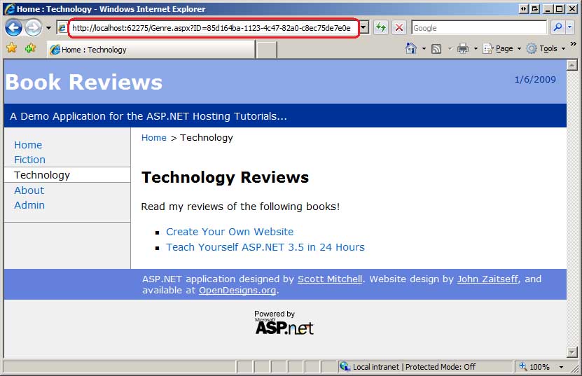 Poprzednia wersja strony przeglądów książek miała oddzielną stronę ASP.NET dla każdej książki. Na przykład istniała strona o nazwie ~/Tech/TYASP35.aspx, która zawierała recenzję książki Teach Yourself ASP.NET 3.5 w ciągu 24 godzin. Ta nowa wersja witryny internetowej oparta na danych zawiera recenzje przechowywane w bazie danych i jedną stronę ASP.NET, Review.aspx?ID=bookId, która wyświetla przegląd określonej książki. Podobnie istnieje strona Genre.aspx?ID=genreId zawierająca listę recenzowanych książek w określonym gatunku.