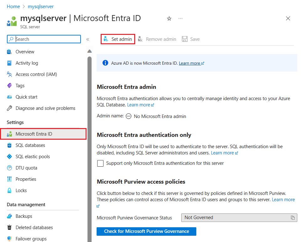 W witrynie Azure Portal na stronie serwera SQL wybierz pozycję Microsoft Entra ID z menu zasobów, a następnie wybierz pozycję Ustaw administratora, aby otworzyć okienko Microsoft Entra ID.