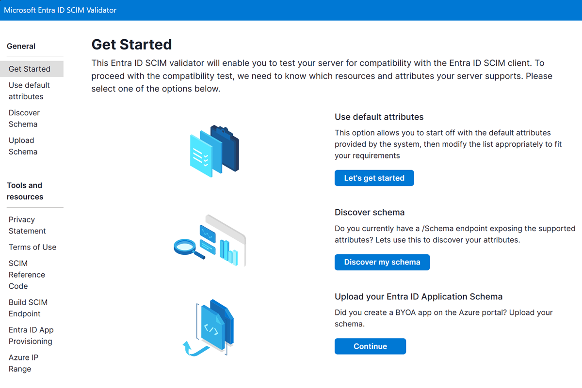 Otwórz przeglądarkę internetową i przejdź do modułu sprawdzania poprawności SCIM: https://scimvalidator.microsoft.com/.