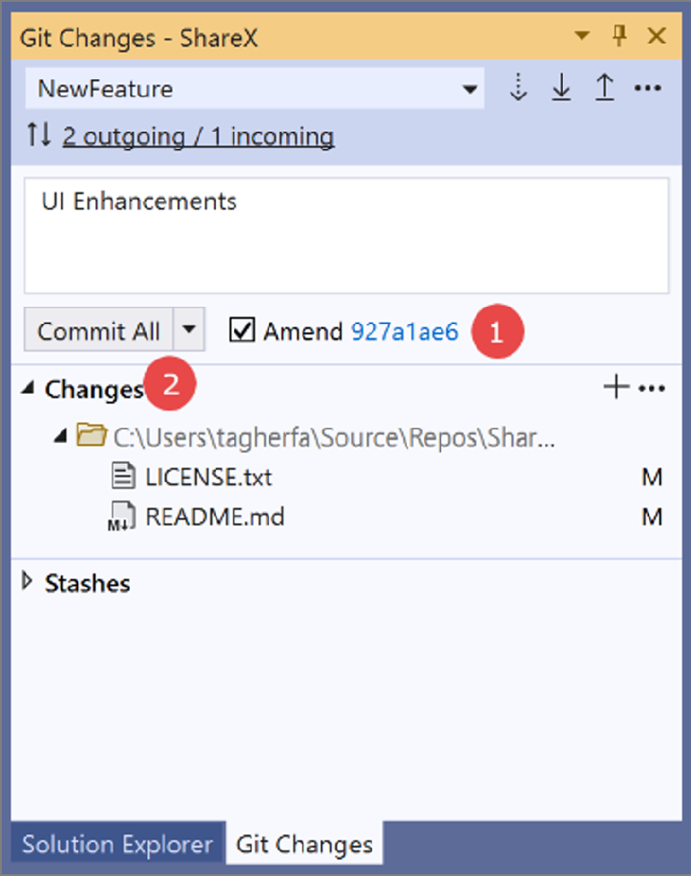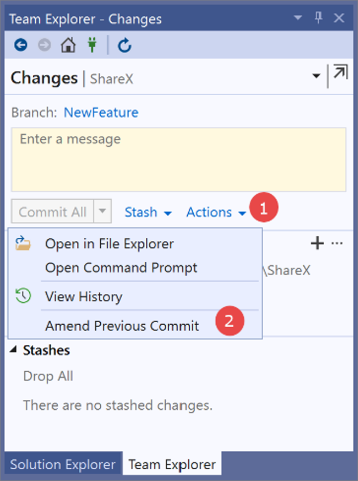 Amend a commit Screenshot of the Changes window for Team Explorer in Visual Studio 2019, with an 'amend a commit' procedure overlay.