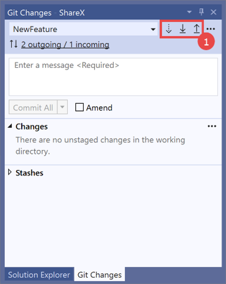 1. Locate the fetch, pull, and push buttons in the Git Changes window.