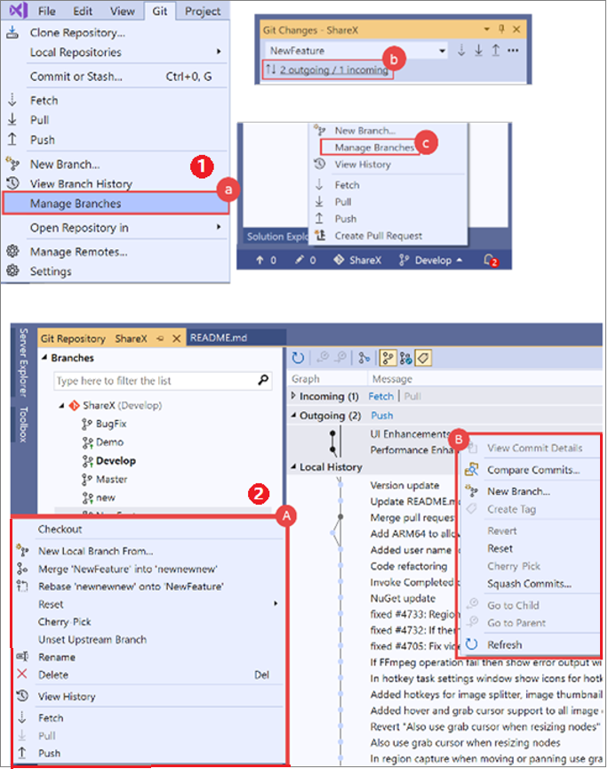 Screenshot collage of how three UI options to use to manage branches in Visual Studio 2019.