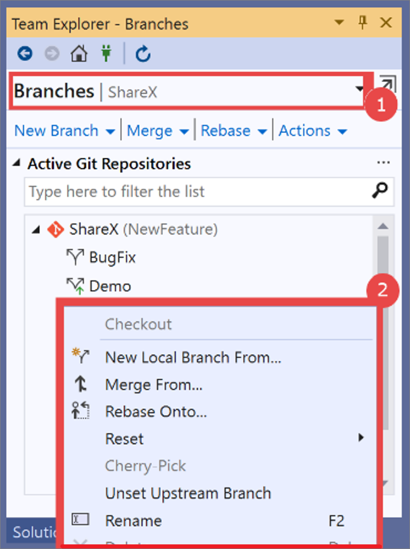 a. From the top-level Visual Studio menu, select Git > Manage Branches.