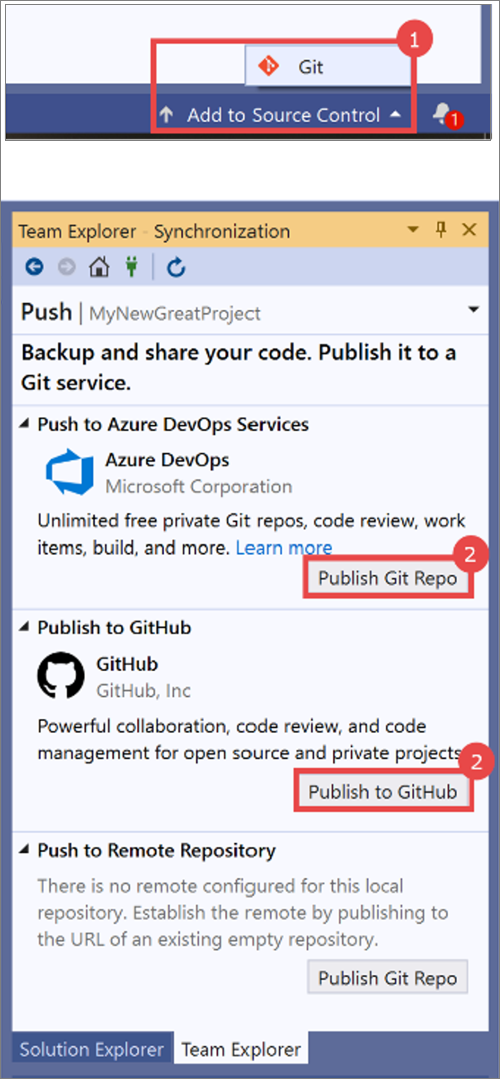 Add a solution to source control and create a new repository Screenshot collage of Team Explorer options in Visual Studio 2019, with an Add to Source Control - Create Repo procedure overlay.